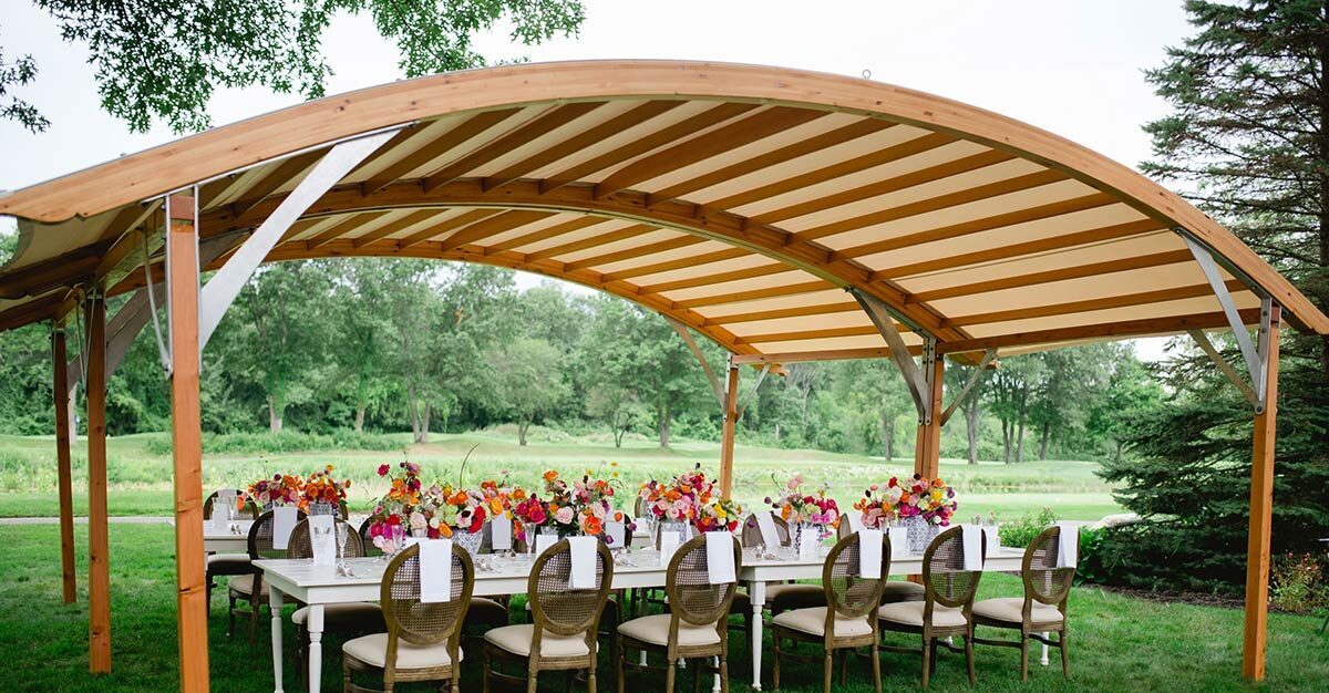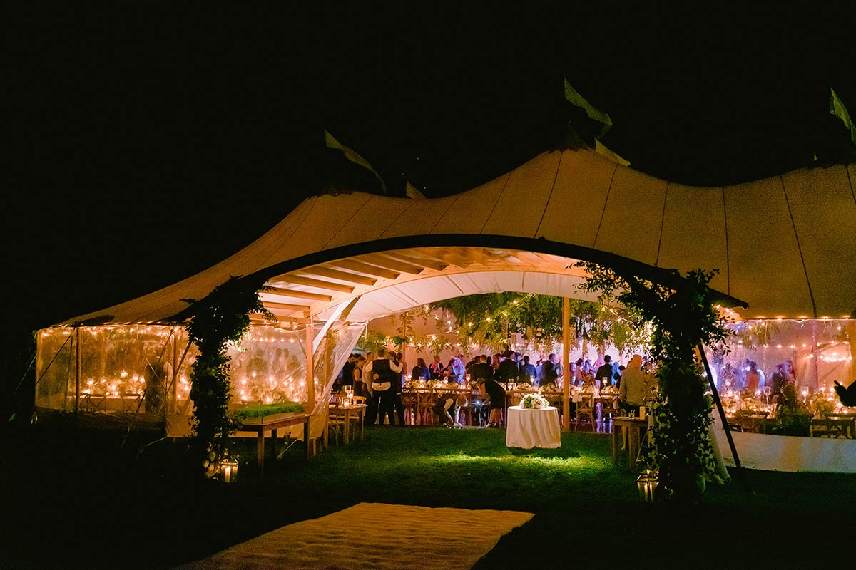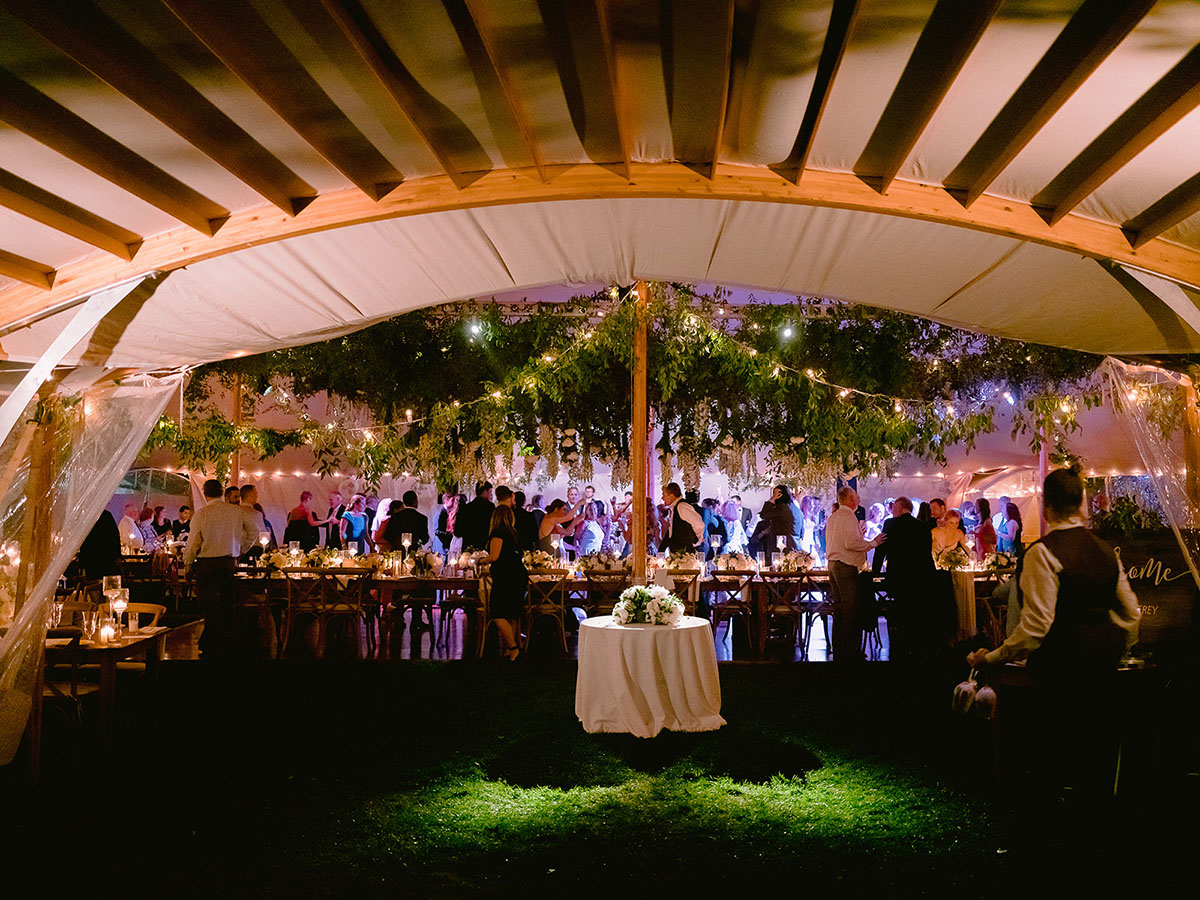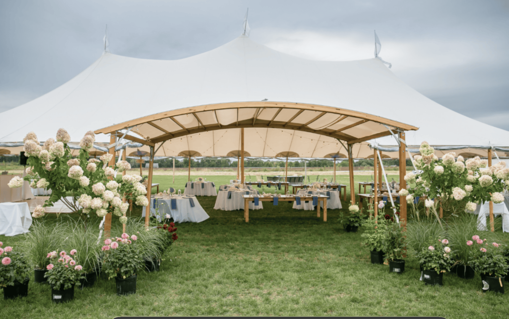 Measuring 10’ x 20’, the Aurora Archway is often used to create a grand entrance to a reception tent, connect event spaces, or highlight areas such as bars, lounge seating, ceremony sites, or live entertainment. With sweeping sailcloth lines and handcrafted wooden arches that echo the surrounding tent structures, the Aurora Archway becomes a natural extension of the overall event environment.